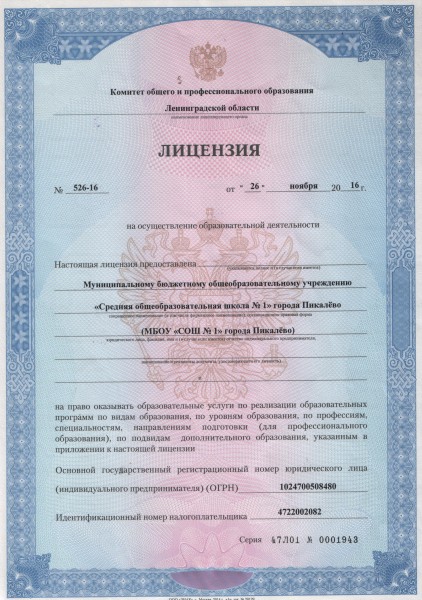 | Полное наименование образовательной организации* | Муниципальное бюджетное общеобразовательное учреждение «Средняя общеобразовательная школа № 1» города Пикалёво |