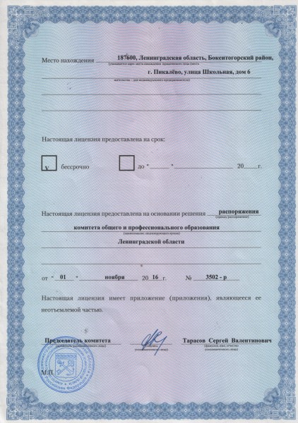 | Адрес местонахождения образовательной организации* | 187600, Ленинградская область, г. Пикалево, ул. Школьная, дом 6. Бокситогорский район, посёлок Совхозный, дом 16. |