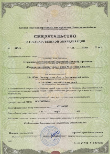 | Сокращенное наименование образовательной организации* | МБОУ «СОШ № 1» города Пикалёво |